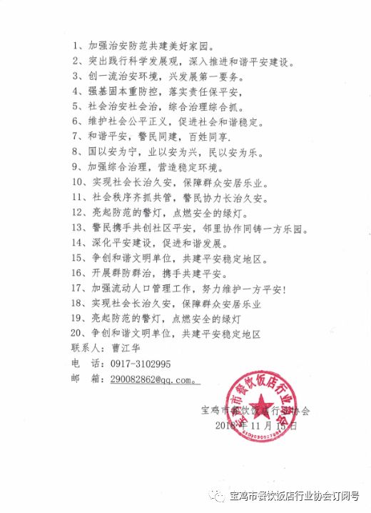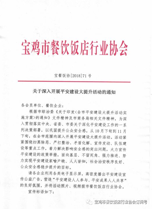 各会员单位、餐饮企业: 根据市综治委《关于印发<全市平安建设大提升活动实施方案>的通知》文件精神及市商务局相关文件精神,为深入贯彻落实中央、省委、市委关于深化平安建设工作的一系列决策部署,以巩固提升公众安全感,从10月下旬到11月下旬,在全市范围内深入开展平安建设大提升活动。活动紧紧围绕扫黑除恶、严打整治、矛盾化解、宣传发动、队伍建设等重点工作,着力解决影响安全感的突出问题,大力宣传平安建设的政策举措,面向基层、不留死角、强力推进、努力实现平安建设家喻户晓、人人皆知,社会治安秩序良好、公众安全感稳步提升的目标。 请各企业利用各类电子显示屏,高密度播出平安建设宣传公益广告,营造“平安建设人人参与、平安成果人人共享”的良好氛围,并将活动照片、视频报市餐饮饭店行业协会。 宣传标语如下: 1、加强治安防范共建美好家园。 2、突出践行科学发展观,深入推进和谐平安建设。 3、创一流治安环境,兴发展第一要务。 4、强基固本重防控,落实责任保平安。 5、社会治安社会治,综合治理综合抓。 6、维护社会公平正义,促进社会和谐稳定。 7、和谐平安,警民同建,百姓同享。 8、国以安为宁,业以安为兴,民以安为乐。 9、加强综合治理,营造稳定环境。 10、实现社会长治久安,保障群众安居乐业。 11、社会秩序齐抓共管,警民协力长治久安。 12、亮起防范的警灯,点燃安全的绿灯。 13、警民携手共创社区平安,邻里协作同铸一方乐园。 14、深化平安建设,促进和谐发展。 15、争创和谐文明单位,共建平安稳定地区。 16、开展群防群治,携手共建平安。 17、加强流动人口管理工作,努力维护一方平安! 18、实现社会长治久安,保障群众安居乐业。 19、亮起防范的警灯,点燃安全的绿灯。 20、争创和谐文明单位,共建平安稳定地区。
