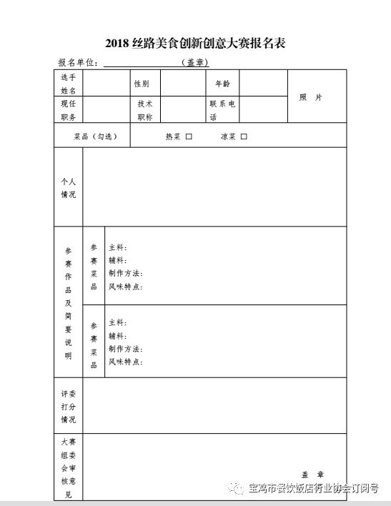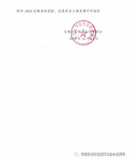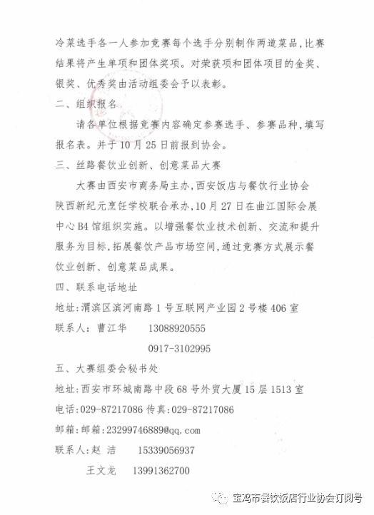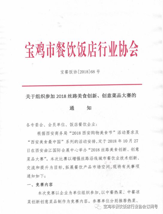 关于组织参加2018丝路美食创新、创意菜品大赛的通知 各专委会、会员单位、饭店餐饮企业: 根据西安商务局“2018西安购物美食节”活动要求及“西安美食最中国”系列的活动安排,定于2018年10月27日在西安曲江国际会展中心举办“2018丝路美食创新、创意菜品大赛”。本次比赛以增强丝路沿线城市餐饮业技术创新、交流和提升为目标,拓展餐饮产品市场空间,现将有关事项通知如下: