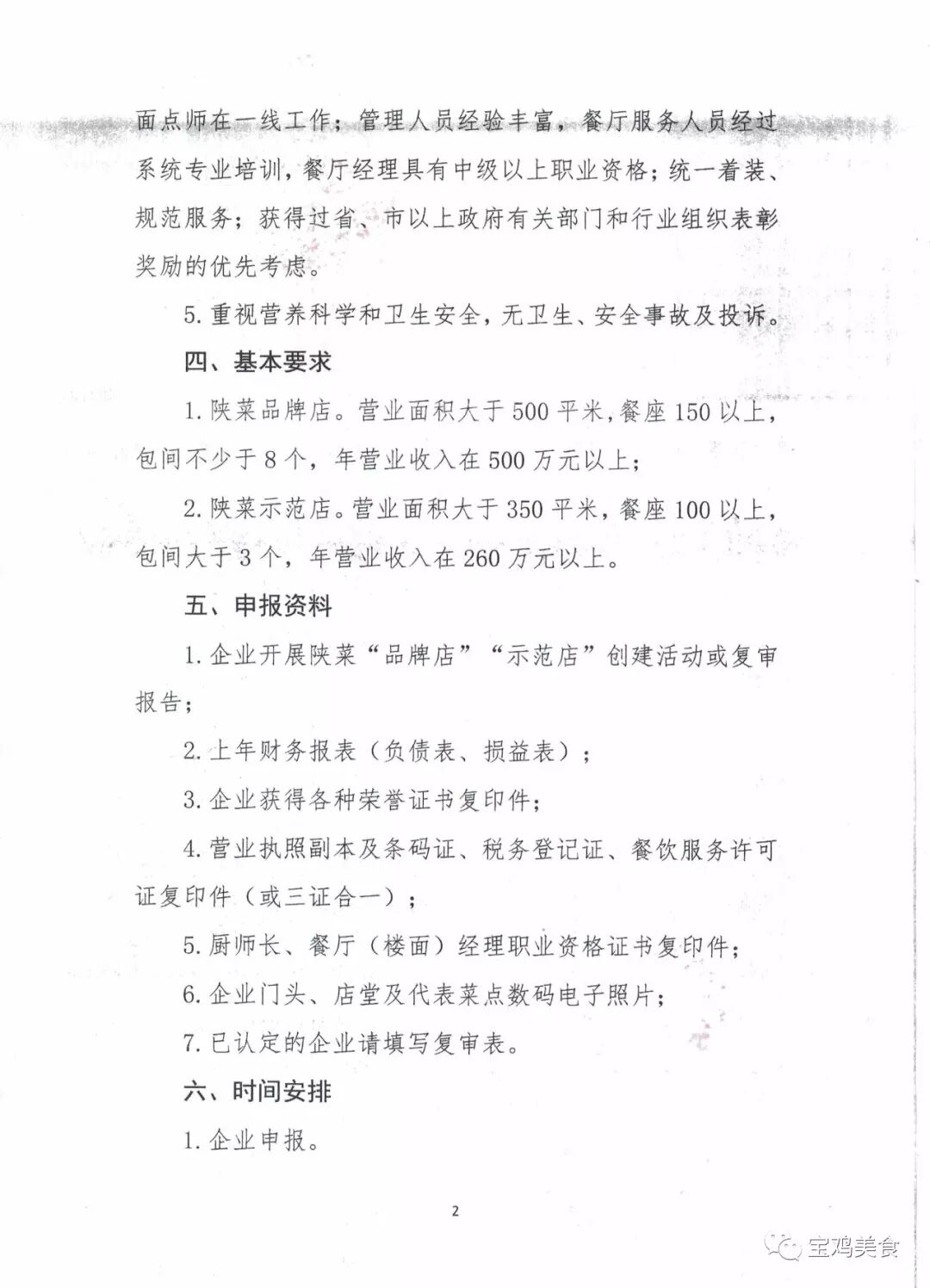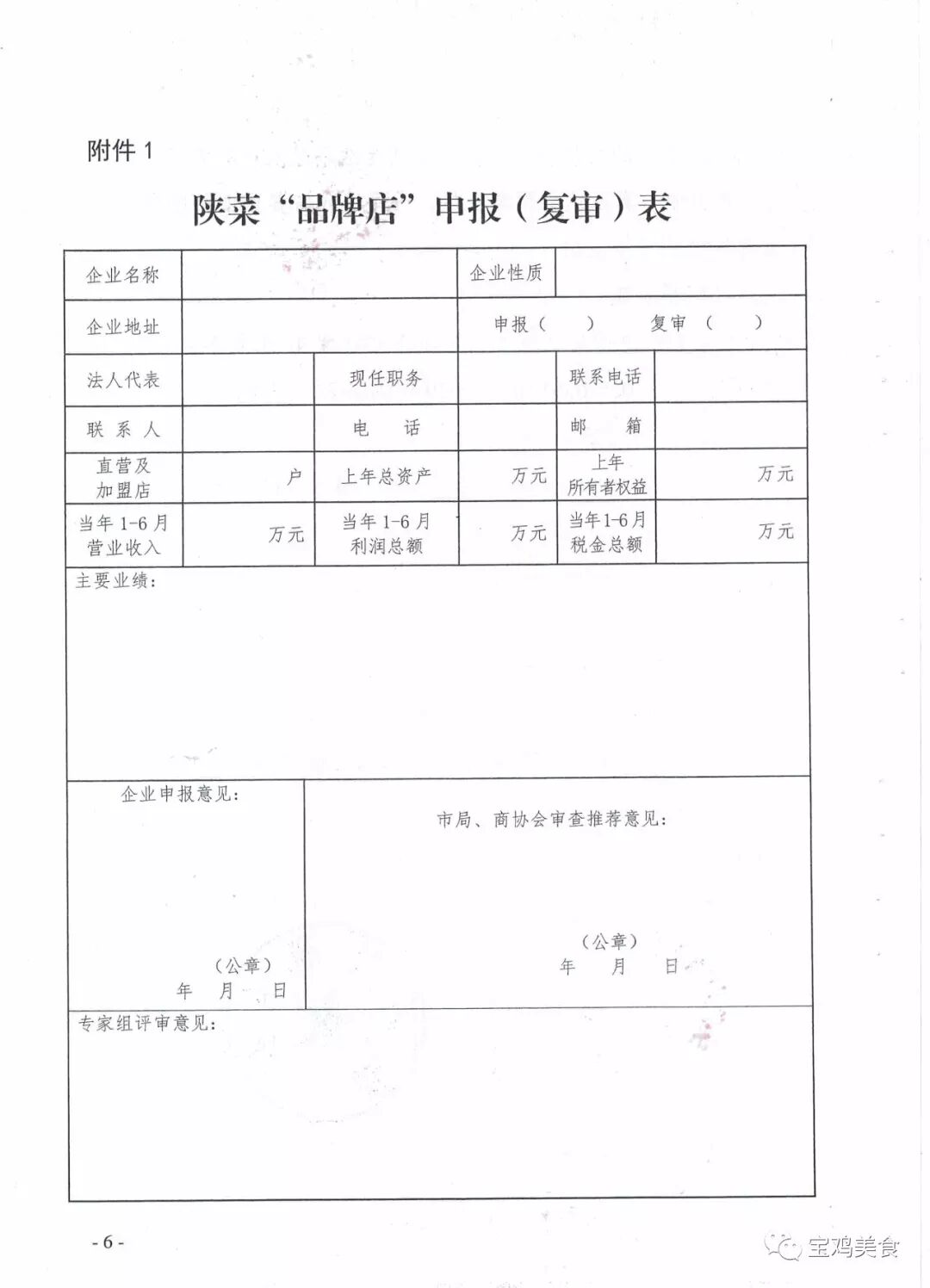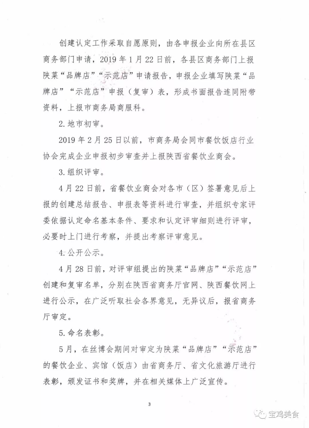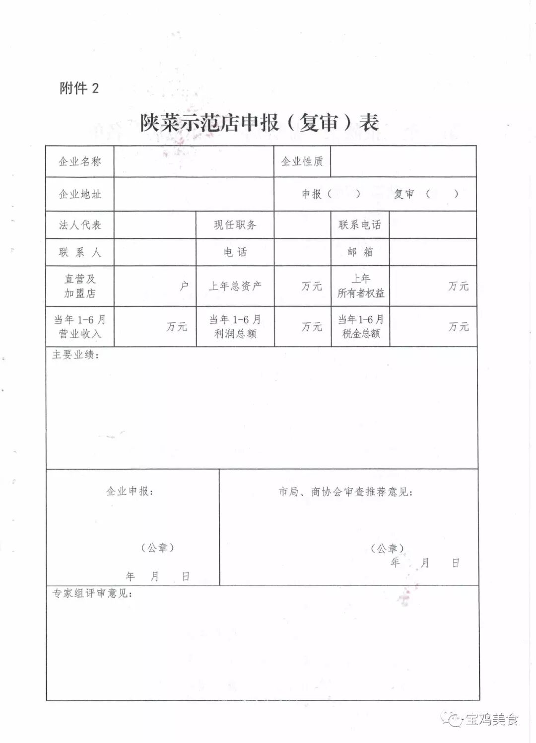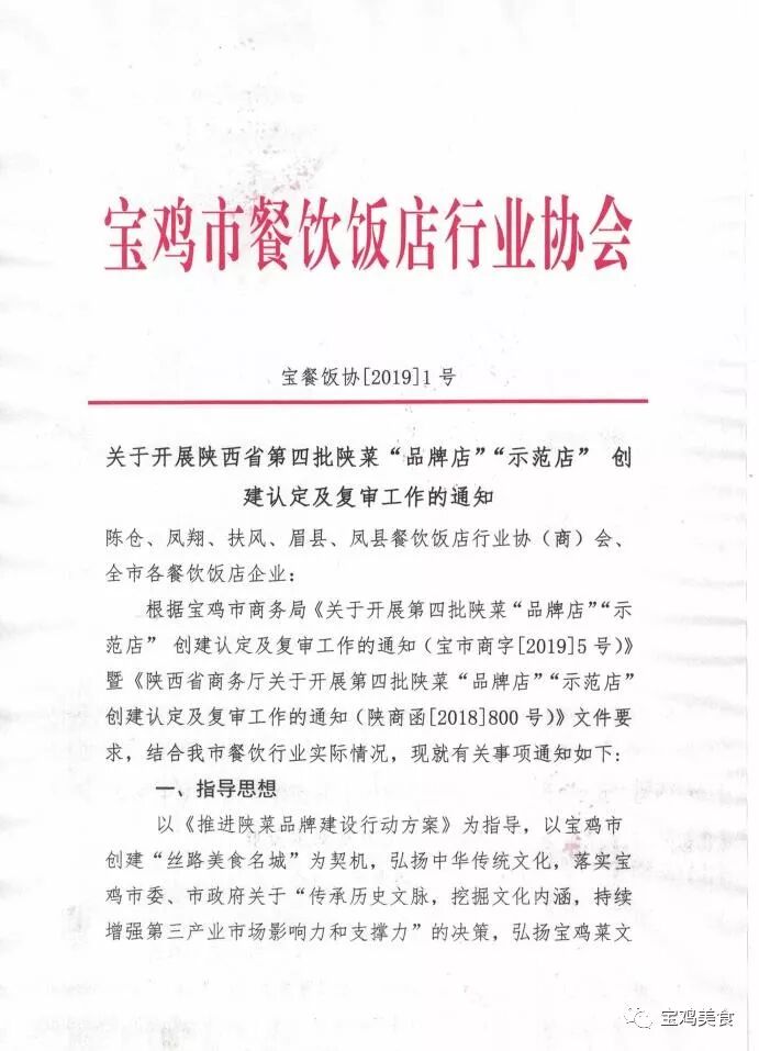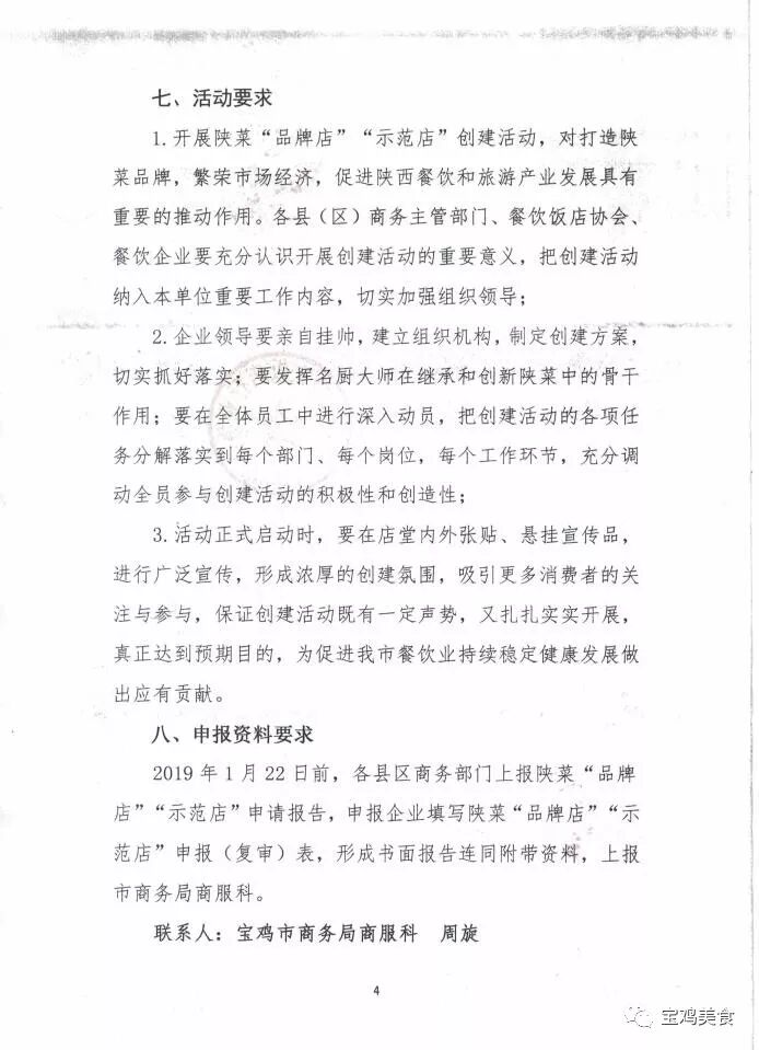 关于开展陕西省第四批陕菜“品牌店”“示范店” 创建认定及复审工作的通知 陈仓、凤翔、扶风、眉县、凤县餐饮饭店行业协(商)会、全市各餐饮饭店企业: 根据宝鸡市商务局《关于开展第四批陕菜“品牌店”“示范店” 创建认定及复审工作的通知(宝市商字[2019]5号)》暨《陕西省商务厅关于开展第四批陕菜“品牌店”“示范店” 创建认定及复审工作的通知(陕商函[2018]800号)》文件要求,结合我市餐饮行业实际情况,现就有关事项通知如下: 一、指导思想 以《推进陕菜品牌建设行动方案》为指导,以宝鸡市创建“丝路美食名城”为契机,弘扬中华传统文化,落实宝鸡市委、市政府关于“传承历史文脉,挖掘文化内涵,持续增强第三产业市场影响力和支撑力”的决策,弘扬宝鸡菜文化、提升宝鸡菜品牌、打造宝鸡菜精品,做活宝鸡文化,讲好宝鸡美食故事,让宝鸡饮食文化在国际国内舞台绽放魅力。 二、认定范围 创建活动在全市餐饮企业及星级宾馆、饭店中开展,参与创建活动的企业,必须是以经营陕西(关中、陕南、陕北)风味菜肴、面点、小吃为主的酒店(宾馆、饭店)、酒家(饭庄、酒楼、餐馆)和餐饮连锁企业。 三、认定条件 1.申报企业必须是独立法人执业资格,《营业执照》《餐饮服务许可证》《税务登记证》(或三证合一)等证照齐全,环保、消防等各项要求达标合格。开业满两年以上。 2.经营的菜品80%以上为陕菜或陕西面点、小吃。陕菜传承创新特点突出、成效显著;菜点质量稳定、风味特色明显;在市场中享有较高知名度;获得过“陕西餐饮名店”“中华餐饮名店”“陕西名菜”“中国名菜”“陕西名小吃”“中华名小吃”,在省级以上赛事中获奖的企业优先考虑。 3.硬件设施(店堂装饰、餐厅布局、厨房设备、安全卫生设施、公共服务项目等)有档次,符合规范要求,文化特点突出。 4.企业管理制度健全,运行科学规范,服务质量好;厨师队伍40%以上具有中级职业资格,至少有1名高级烹调师、面点师在一线工作;管理人员经验丰富,餐厅服务人员经过系统专业培训,餐厅经理具有中级以上职业资格;统一着装、规范服务;获得过省、市以上政府有关部门和行业组织表彰奖励的优先考虑。 5.重视营养科学和卫生安全,无卫生、安全事故及投诉。 四、基本要求 1.陕菜品牌店。营业面积大于500平米,餐座150以上,包间不少于8个,年营业收入在500万元以上; 2.陕菜示范店。营业面积大于350平米,餐座100以上,包间大于3个,年营业收入在260万元以上。 五、申报资料 1.企业开展陕菜“品牌店”“示范店”创建活动或复审报告; 2.上年财务报表(负债表、损益表); 3.企业获得各种荣誉证书复印件; 4.营业执照副本及条码证、税务登记证、餐饮服务许可证复印件(或三证合一); 5.厨师长、餐厅(楼面)经理职业资格证书复印件; 6.企业门头、店堂及代表菜点数码电子照片; 7.已认定的企业请填写复审表。 六、时间安排 1.企业申报。 创建认定工作采取自愿原则,由各申报企业向所在县区商务部门申请,2019年1月22日前,各县区商务部门上报陕菜“品牌店”“示范店”申请报告,申报企业填写陕菜“品牌店”“示范店”申报(复审)表,形成书面报告连同附带资料,上报市商务局商服科。 2.地市初审。 2019年2月25日以前,市商务局会同市餐饮饭店行业协会完成企业申报初步审查并上报陕西省餐饮业商会。 3.组织评审。 4月22日前,省餐饮业商会对各市(区)签署意见后上报的创建总结报告、申报表等资料进行审查,并组织专家评委依据认定命名基本条件、要求和认定评审细则进行评审,必要时上门进行考察,并提出考察评审意见。 4.公开公示。 4月28日前,对评审组提出的陕菜“品牌店”“示范店”创建和复审名单,分别在陕西省商务厅官网、陕西餐饮网上进行公示,在广泛听取社会各界意见,无异议后,报省商务厅审定。 5.命名表彰。 5月,在丝博会期间对审定为陕菜“品牌店”“示范店”的餐饮企业、宾馆(饭店)由省商务厅、省文化旅游厅进行表彰,颁发证书和奖牌,并在相关媒体上广泛宣传。 七、活动要求 1.开展陕菜“品牌店”“示范店”创建活动,对打造陕菜品牌,繁荣市场经济,促进陕西餐饮和旅游产业发展具有重要的推动作用。各县(区)商务主管部门、餐饮饭店协会、餐饮企业要充分认识开展创建活动的重要意义,把创建活动纳入本单位重要工作内容,切实加强组织领导; 2.企业领导要亲自挂帅,建立组织机构,制定创建方案,切实抓好落实;要发挥名厨大师在继承和创新陕菜中的骨干作用;要在全体员工中进行深入动员,把创建活动的各项任务分解落实到每个部门、每个岗位,每个工作环节,充分调动全员参与创建活动的积极性和创造性; 3.活动正式启动时,要在店堂内外张贴、悬挂宣传品,进行广泛宣传,形成浓厚的创建氛围,吸引更多消费者的关注与参与,保证创建活动既有一定声势,又扎扎实实开展,真正达到预期目的,为促进我市餐饮业持续稳定健康发展做出应有贡献。 八、申报资料要求 2019年1月22日前,各县区商务部门上报陕菜“品牌店”“示范店”申请报告,申报企业填写陕菜“品牌店”“示范店”申报(复审)表,形成书面报告连同附带资料,上报市商务局商服科。 九、联系方式 宝鸡市商务局商服科 周旋 电话:3260746 13891716542 宝鸡市餐饮饭店行业协会 曹江华 电话:3102995 13088920555