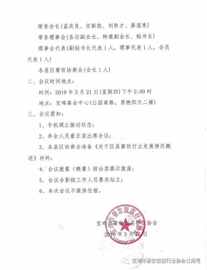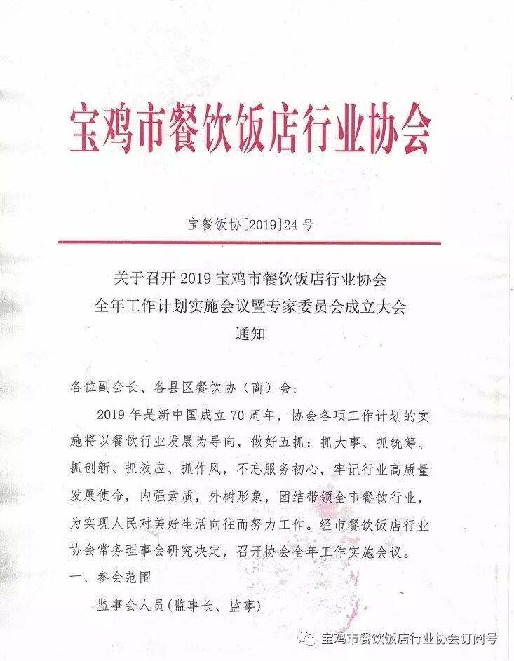 关于召开2019宝鸡市餐饮饭店行业协会全年工作计划实施会议暨专家委员会成立大会通知