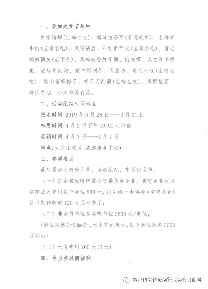 (一)协会名优特产暨小吃委员会企业、名吃企业收取搭建成本费用每个展位880元,门头统一由协会《宝鸡美食》设计制作收取120元成本费用;