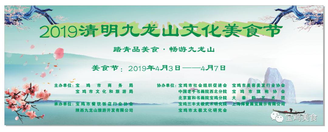 本次文化旅游美食节由宝鸡市商务局、宝鸡市文化和旅游局主办,宝鸡市餐饮饭店行业协会、陕西九龙山旅游开发有限公司承办,宝鸡市社会组织促进会、中国老子书画院西北分院、北京宣和书画院宝鸡分院、宝鸡三丰太极武术研究院、宝鸡市太极文化研究会、宝鸡市美容美发行业协会、宝鸡市旗袍与传承发展协会、大秦韵艺术团8家社会组织协办。