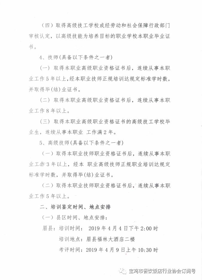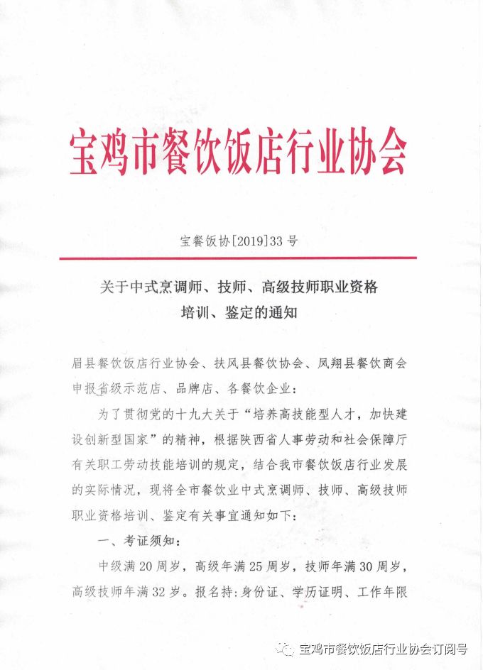 为了贯彻党的十九大关于“培养高技能型人才,加快建设创新型国家”的精神,根据陕西省人事劳动和社会保障厅有关职工劳动技能培训的规定,结合我市餐饮饭店行业发展的实际情况,现将全市餐饮业中式烹调师、技师、高级技师职业资格培训、鉴定有关事宜通知如下: