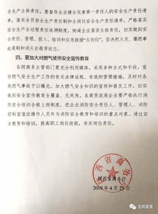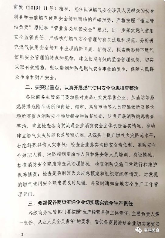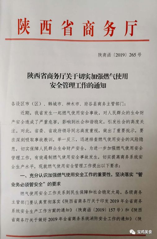燃气使用安全工作关系到民生保障和社会稳定大局。各级商务主管部门要认真贯彻落实《陕西省商务厅关于印发2019年全省商务系统安全生产工作方案的通知》(陕商函(2019)157号)和《陕西省商务厅关于做好2019年全省商务系统消防安全工作的通知》(映商发(2019)11号)精神,充分认识燃气安全涉及人民群众的切身利益和当前燃气使用安全管理面临的严峻形势,严格按照“谁主管谁负责”原则和“管业务必须管安全”要求,进一步落实燃气使用安全监管责任,严格执行燃气安全管理的有关法规和规范,分析研究燃气使用安全管理中出现的新问题、新情况,探索新形势下燃气使用安全管理的特点和规律,建立长期有效的监督管理机制,切实采取有效措施,坚决遏制和防范燃气安全事故的发生,保障人民群众生命和财产安全。