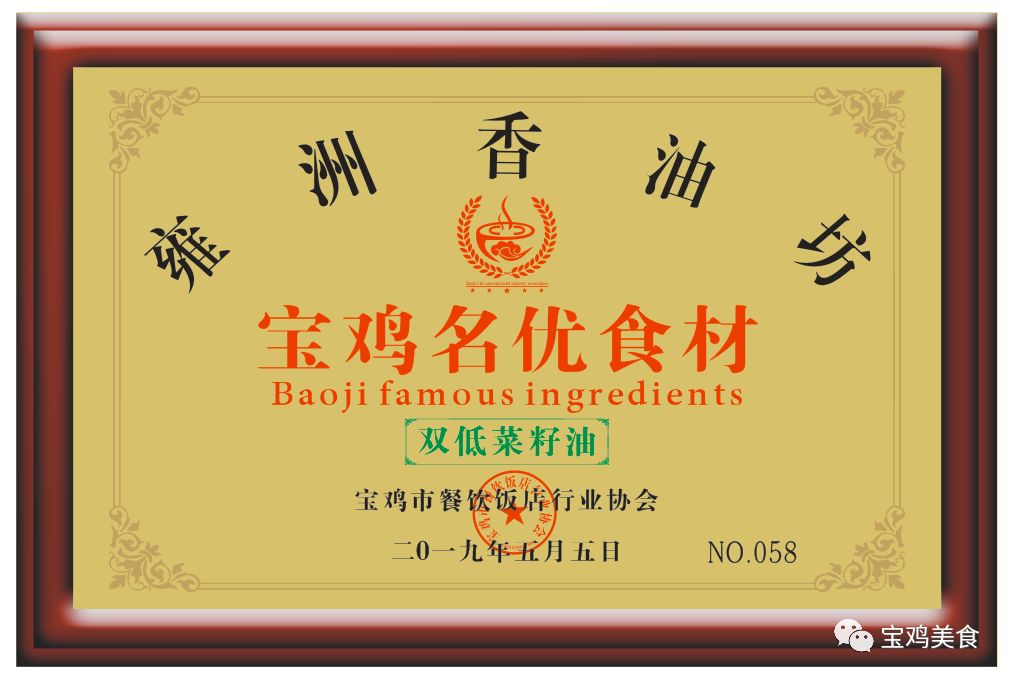 2019年4月28日,宝鸡市餐饮饭店行业协会对“雍洲香油坊”进行“宝鸡名优食材”品牌评审认定。