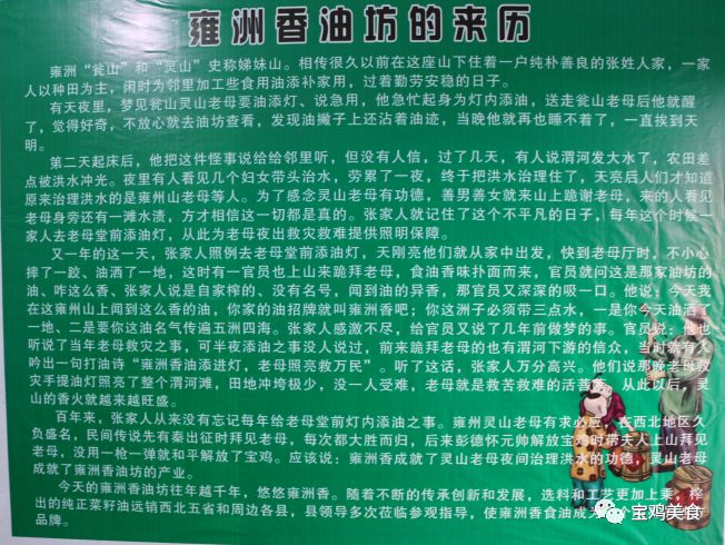 凤翔西北有个名山灵山,因秦穆公狩猎得灵鹫鸟而得名。山上有个净慧寺,供奉的主神为灵山老母,据说福泽四海,至今香火鼎盛。相传,很久以前,一个风雨大作的夜晚,山下开油坊的张老板突然梦见灵山老母冒雨造访,说是灯油不足要添点油,他忙照办。梦中醒来,觉得奇怪,到油坊一看,不由大吃一惊,油撇子上果然粘着新鲜的油迹。过了几日,从宝鸡城传来消息,说前几天渭河发大水,差点冲光四周村舍和田园,突然一个白发老太太打着灯笼治水,这才拯救了百姓。原来那夜灵山老母向他借油去渭河治水了。从此,主人便年年去灵山给老母殿添油,保佑全家平安,生意兴隆。有一年,他不慎将油撒了一地,顿时油香四溢,众香客惊问这是谁家油坊的油咋这么香?进香的县官当即给他赐名“雍洲香”,还特意说明,“州”是“三点水”的“洲”,让他这油香遍五湖四海。他家的生意就更兴盛了,绵延几百年,延续至今。