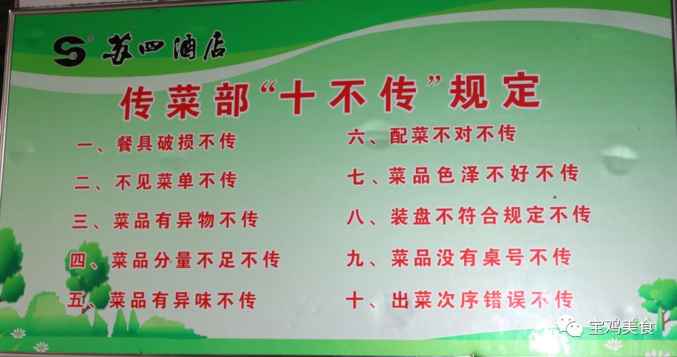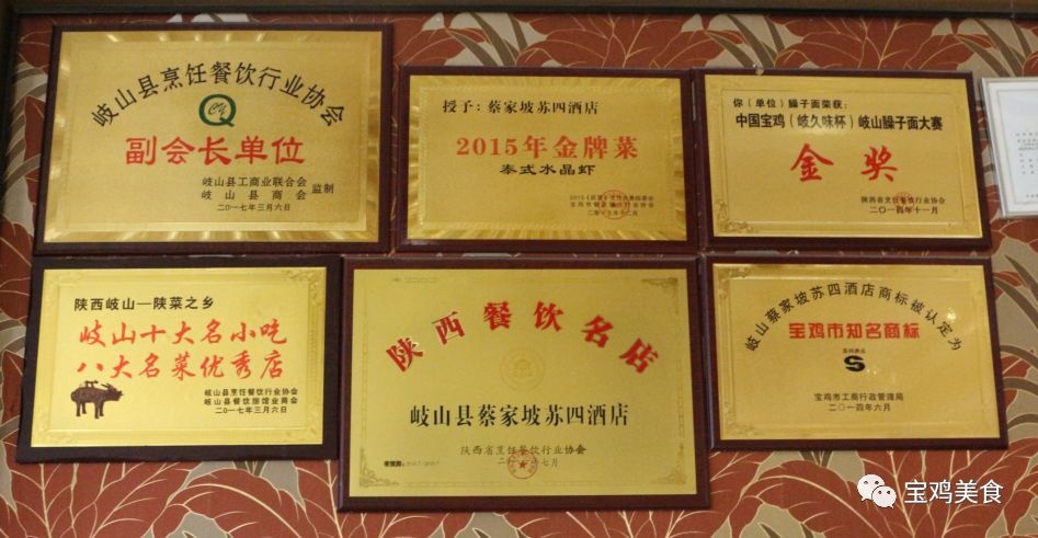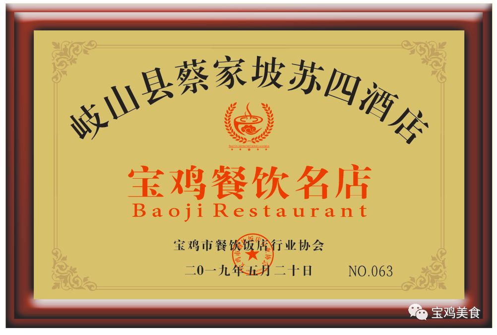 2019年5月14日,宝鸡市餐饮饭店行业协会对“岐山县蔡家坡苏四酒店”进行“宝鸡餐饮名店”品牌评审认定。