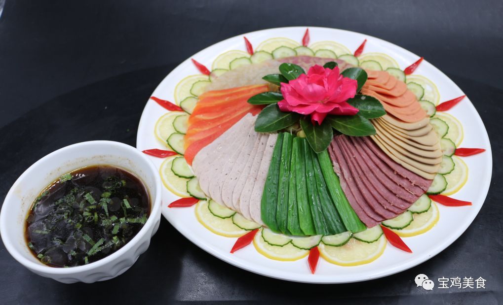一道“西府什锦拼盘”,刀工仔细,肘花皮冻如刀裁,码放得严丝合缝仿佛不苟言笑的人。我知道凉盘内也就是豆芽凉菜垫着,可肯把豆芽凉菜的拼盘用如此严谨手法铺排的大厨,心思该是何等细腻?这应该是厨师对一道西府传统凉菜的应有尊重。