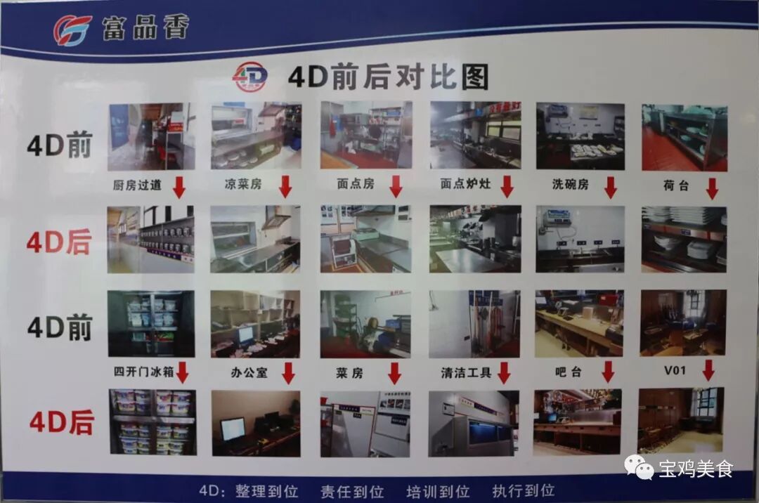 高老师带着企业代表一边参观一边讲解,据了解,4D厨房是近年来兴起的,富品香酒店就是引入了4D厨房的新管理方式,让厨房环境和菜肴出品标准化、精细化,真正让食客吃得放心,有效降低了餐饮食品安全风险。实行“整理到位、责任到位、培训到位、执行到位”这四个到位的“4D现场管理体系”,让餐具有家、厨房无水、工作各负其责、执行力强,有效提升了食品安全管理水平,实现了企业、顾客、员工“三赢”。