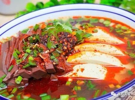 不一会儿,粉汤羊血端就上来了。我第一眼就对那只青花瓷大老碗喜欢的不得了,光洁精细、釉彩光亮,再看看碗里红艳艳、油汪汪,飘散着沁人心脾的饭菜更是让人垂涎三尺。真是美食配美器,才是人间极品呀。碗里深红色的羊血均匀的切成条形,晶莹剔透,鲜嫩爽口,里面掺和着白嫩白嫩的豆腐、点缀着新绿的香菜,当然也离不了我们陕西人最爱的油泼辣子了。四周飘散着一股浓浓的清香味,我迫不及待的尝了一口,麻、辣,香、煎,禁不住美食的诱惑,胃口大开,竟越吃越爱吃,吃得人满头冒汗,喝得肚子滚圆滚圆。