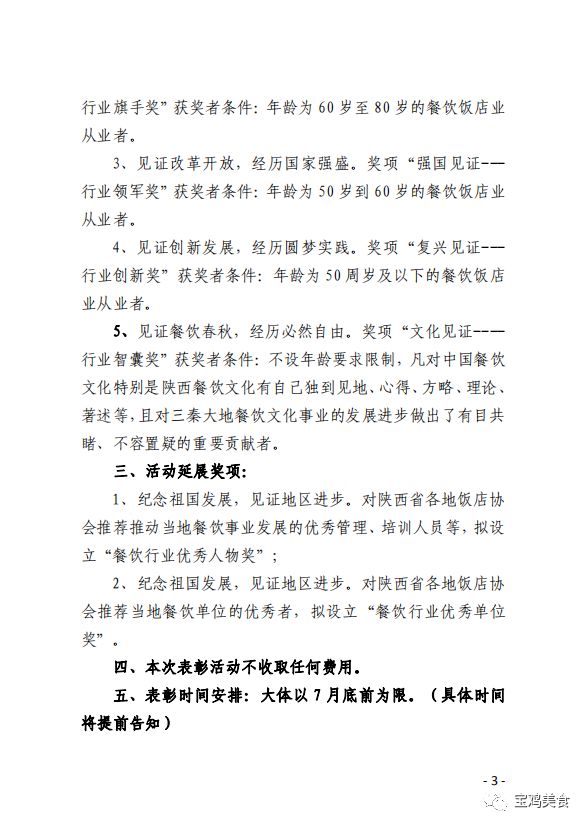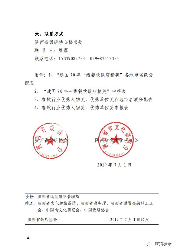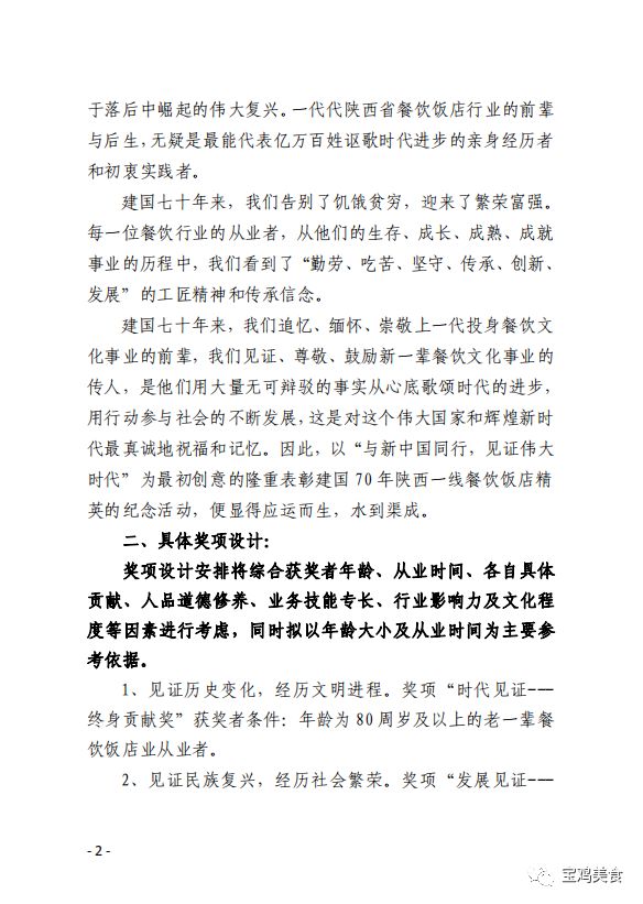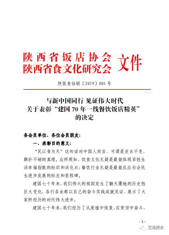根据陕西省饭店协会、陕西省食文化研究会关于“与新中国同行 见证伟大时代 关于表彰‘建国70年一线餐饮饭店精英’ 的决定”,经餐饮行业专家评审通过,现向社会公示宝鸡“建国70年一线餐饮饭店精英”名单:一、建国70周年餐饮行业优秀单位奖(52户)陕西味司农食品管理运营有限公司、宝鸡市华旗国际酒店、老码头火锅(宝鸡市)、宝鸡市凤皇酒店管理有限公司(凤皇酒店)、宝鸡市百中大商贸有限公司(爱姆大酒店)、宝鸡市柒号餐饮管理有限责任公司(柒号餐厅)、渭滨区牟记西秦铡面馆、宝鸡市渭滨区家辉饸饹店、祥子刀削面、宝鸡市渭滨区小侯家面庄、宝鸡市渭滨区老乡亲饭庄、宝鸡市高新区团圆餐饮楼、陕西宝鸡张辉餐饮有限公司、宝鸡老八米线、宝鸡市秦东食品有限公司、王晨曦小馆子、宝鸡凤鸣岐香食品科技有限公司、游师傅湘菜、宝鸡市高新区满口香兄弟饺子馆、陕西省食尚餐饮娱乐管理有限公司、宝鸡市大辫子餐饮管理有限公司、宝鸡市金台区李记川渝小炒王店、宝鸡市林改荣葫芦头、秀丽民俗酒楼、福源家宴、宝鸡市陈仓区马家水盆羊肉、岐山小张手工面馆、岐山县蔡家坡天下香饭店、宝鸡市岐山县幸福人家餐饮食品有限公司、岐山县又一家饭店、岐山县唐香村风味烤鱼坊、宝鸡德有邻食品有限公司、岐山县蔡家坡苏四酒店、岐山县凤鸣国际酒店有限责任公司、岐山县秦唐瓦罐餐饮有限公司、岐山小玲臊子面经营户、碧水湾生态休闲庄园、宝鸡眉县汤峪镇雨润大酒店、和顺长面荘、眉县逸乐生态农业发展有限责任公司、创意中国菜、眉县欣钛如意酒店有限公司、陇县关山大酒店有限责任公司、尚德酒店(陇县)、宝鸡福圆法门大酒店管理有限公司、扶风县胖老午大锅羊肉、扶风县超时代鱼火锅、凤翔县雍洲香油坊、陕西省凤翔县西府酿造研究所、西凤酒文化主题酒店、陕西千香百味食品有限公司、千阳县千阳宾馆。(排名不分先后)二、建国70周年陕西餐饮行业旗手奖(7人)易渲承、孟庆良、赵更生、李培福、张青贤、孙周乃、高建敏(女)。(排名不分先后)三、建国70周年陕西餐饮行业领军奖(70人)庞再武、肖红军、刘红军、赵永祥、肖建辉、王军兵、李小虎、王利平、李宝林、张新广、李小虎(李刚)、权掌掌、张永兵、杨根勤、梁文岐、李军武、李小兵、苏小军、王建超、杨彦荣、闫炳科、王雪琴(女)、纪青会(女)、王招明、王金鱼、何海军、车睿豪、于新兵、杨宝菁、康少吕、麻小铭、王建勤、杨康利、贾昀、马林绪、雷学义、屈积怀、路东兴、赵亚萍(女)、翟红斌、段中华、张旭、刘忠奎、王社民、高文勇、张平科、付海强、王建红、王凤娥(女)、张鹏飞、张博刚、李见平、王党伟、王万军、薛建文、张宏岗、龚立乾、刘文涛、杨涛、王涛、周建设、鲁志峰、柏艳丽(女)、李保田、边忠会、宫小军、王治民、刘玉堂、宋红科、冯钊。(排名不分先后)四、建国70周年陕西餐饮行业创新奖(37人)李海波、陈斌、张亚刚、崔忠、付明、杨亮、李建海、李小康、谢海鹏、杜海军、田治利、杜文伟、王建刚、刘荣、曾辉、李鹏、田建伟、李建、张小磊、呼昭、周剑波、王瑞武、候哲、张展武、刘铭涧、王文超、豆雨润、田春祥、王钢、谭玉龙、林玮、张红卫、辛鹏辉、何罡、侯俊、仵智勇、王万里。五、建国70周年陕西餐饮行业智囊奖(1人)孙建辉六、公示时间2019年10月10日起一10月12日止七、公示期事宜处理此认定采取社会监督,如在公示期内有重大投诉,陕西省饭店协会、宝鸡市餐饮饭店行业协会核实后取消申请资格。