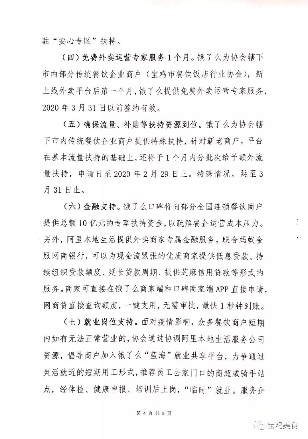 (五)确保流量、补贴等扶持资源到位。饿了么为协会辖下市内传统餐饮企业商户提供特殊扶持,针对新老商户,平台在基本流量扶持的基础上,还将于1个月内分批次给予额外流量扶持,申请日至2020年2月29日止。特殊情况,延至3月31日止。