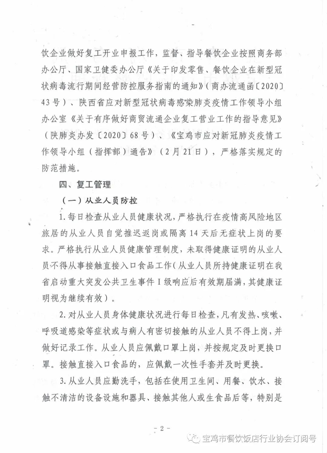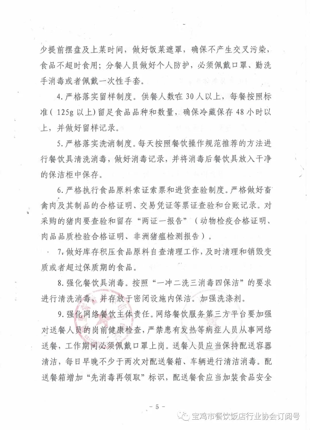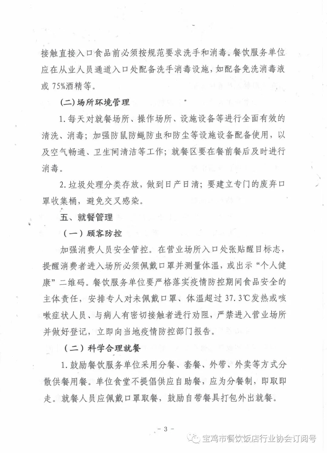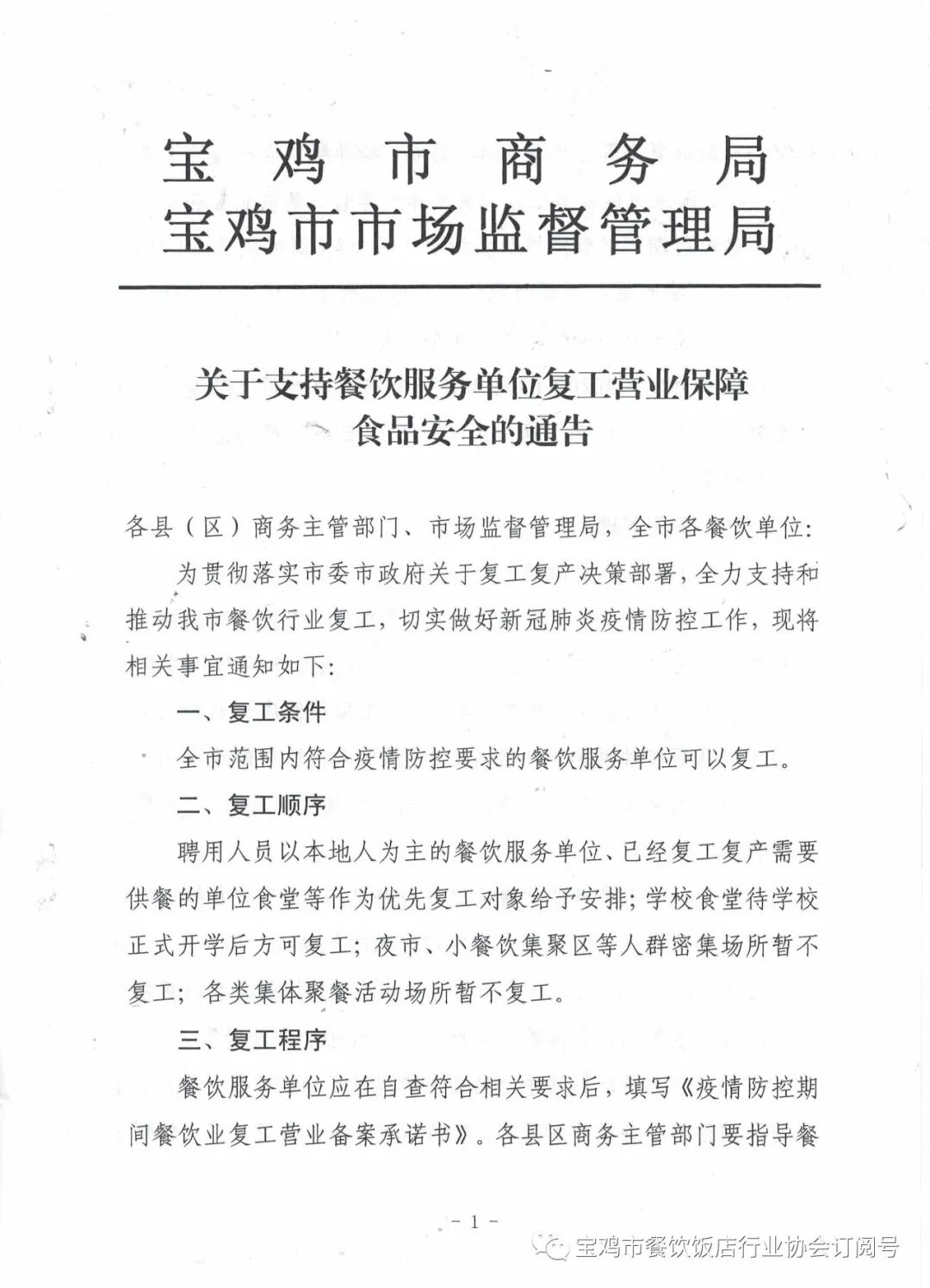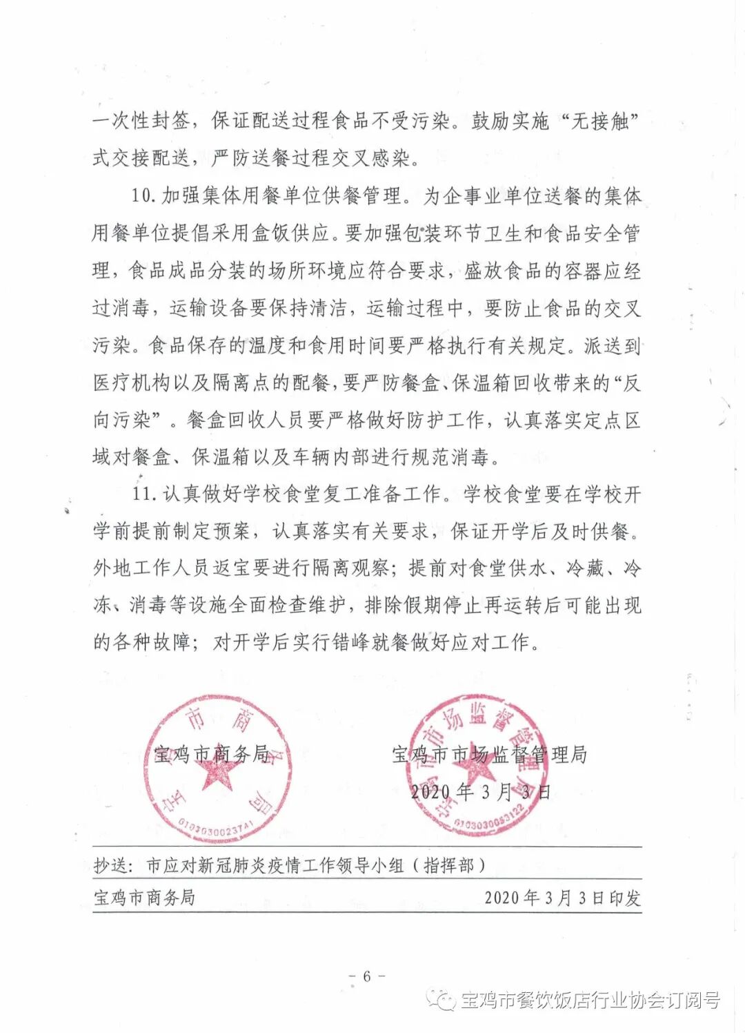 为贯彻落实市委市政府关于复工复产决策部署,全力支持和推动我市餐饮行业复工,切实做好新冠肺炎疫情防控工作,现将相关事宜通知如下:全市范围内符合疫情防控要求的餐饮服务单位可以复工。聘用人员以本地人为主的餐饮服务单位、已经复工复产需要供餐的单位食堂等作为优先复工对象给予安排;学校食堂待学校正式开学后方可复工;夜市、小餐饮集聚区等人群密集场所暂不复工;各类集体聚餐活动场所暂不复工。餐饮服务单位应在自查符合相关要求后,填写《疫情防控期间餐饮业复工营业备案承诺书》。各县区商务主管部门要指导餐饮企业做好复工开业申报工作,监督、指导餐饮企业按照商务部办公厅、国家卫健委办公厅《关于印发零售,餐饮企业在新型冠状病毒流行期间经营防控服务指南的通知》(商办流通函[2020]43号)、陕西省应对新型冠状病毒感染肺炎疫情工作领导小组办公室《关于有序做好商贸流通企业复工营业工作的指导意见》陕肺炎办发[2020]68号),《宝鸡市应对新冠肺炎疫情工作领导小组(指挥部)通告》(2月21日),严格落实规定的防范措施。1.每日检查从业人员健康状况,严格执行在疫情高风险地区旅居的从业人员自觉推迟返岗或隔离14天后无症状上岗的要求。严格执行从业人员健康管理制度,未取得健康证明的从业人员不得从事接触直接入口食品工作(从业人员所持健康证明在我省启动重大突发公共卫生事件级响应后有效期届满,其健康证明视为继续有效)。2.对从业人员身体健康状况进行每日检査,凡有发热、咳嗽、呼吸道感染等症状或与病人有密切接触的从业人员不得上岗,并做好记录工作。从业人员应佩戴口罩上岗,并按规定及时更换口罩。接触直接入口食品的,应佩戴一次性手套并及时更换。3.从业人员应勤洗手,包括在使用卫生间、用餐、饮水、接触不清洁的设备设施和器具、接触其他人或生食品后等,特别是接触直接入口食品前必须按规范要求洗手和消毒,餐饮服务单位应在从业人员通道入口处配备洗手消毒设施,如配备免洗消毒液或75%酒精等。1.每天对就餐场所、操作场所,设施设备等进行全面有效的清洗、消毒;加强防鼠防蝇防虫和防尘等设施设备配备使用,以及空气畅通、卫生间清洁等工作;就餐区要在餐前餐后及时进行消毒。2.垃圾处理分类存放,做到日产日清;要建立专门的废弃口罩收集桶,避免交叉感染。加强消费人员安全管控。在营业场所入口处张贴醒目标志,提醒消费者进入场所必须佩戴口罩并测量体温,或出示“个人健康”二维码。餐饮服务单位要严格落实疫情防控期间食品安全的主体责任,安排专人对未佩戴口罩、体温超过37.3℃发热或咳嗽症状人员,与病人有密切接触者进行劝阻,严禁进入营业场所并做好登记,立即向当地疫情防控部门报告。1.鼓励餐饮服务单位采用分餐、套餐、外带、外卖等方式分散供餐用餐。单位食堂不提倡供应自助餐,应为分餐制,即取即走。就餐人员应佩戴口罩取餐,鼓励自带餐具打包外出就餐。2.鼓励分散供餐。有条件餐饮单位可以在就餐场所采用屏风隔离等物理隔离方式,就餐前才能摘掉口罩,禁止面对面就餐,避免用餐人员直接接触。3.堂食单人单桌,按店内就餐桌数控制进店人数。倡导使用公筷公勺,引导分餐消费,避免交叉传染。4.严禁举办群体性宴席(婚宴、寿宴、满月宴、聚会)等人员集聚活动。供餐数量要与自身规模能力相适应,不得超出许可核准经营项目范围供餐1.严格落实索证索票进货查验制度。禁止加工野生动物及其制品,禁止圈养宰杀活禽,严格落实畜禽产品的索证索票和检疫合格证明规定,做好进货查验记录。原料按贮存条件分类分区存放,避免交又污染;冷藏冷冻食品符合相关温度要求;不得使用腐烂变质、超保质期原料。2.严格落实《餐饮服务食品安全操作规范》。分区加工水产品、肉、蔬菜和面食,避免交叉污染;食品加工要烧熟煮透,确保食品中心温度达到70℃以上;生食、冷食、自制饮品等要严格落实专间或专区操作要求,确保食品安全;中小学和幼儿园严格落实不经营生食、冷食类等禁止经营的食品品种。3.严格落实备餐管理。集体配餐单位和单位食堂,备餐间每天封闭消毒30分钟以上,不是分餐时间尽量不要开门开窗;减少提前摆盘及上菜时间,做好饭菜遮罩,确保不产生交叉污染,食品不超时食用;分餐人员做好个人防护,必须佩戴口罩、勤洗手消毒或者佩戴一次性手套。4.严格落实留样制度。供餐人数在30人以上,每餐按照标准(125g以上)留足食品品种和数量,确保冷藏保存48小时以上,并做好留样记录。5.严格落实洗消制度。每天按照餐饮操作规范推荐的方法进行餐饮具清洗消毒,做好消毒记录,并将消毒后餐饮具放入干净的保洁柜中保存。6.严格执行食品原料索证索票和进货查验制度。严格做好畜禽肉及其制品的合格证明、交易凭证等票证査验和合账记录。对采购的猪肉要查验和留存“两证一报告”(动物检疫合格证明肉品品质检验合格证明、非洲猪瘟检测报告)。7.做好库存积压食品原料自查清理工作,及时清理和销毁变质或者超过保质期的食品。8.强化餐饮具消毒。按照“一冲二洗三消毒四保洁”的要求进行清洗消毒,并存放于密闭设施内保洁。加强洗涤剂。9.强化网络餐饮主体责任。网络餐佽服务第三方平台要加强对送餐人员的岗前健康检査,