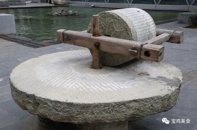 以“五谷”为主食的华夏族人,由于石磨的发明和广泛使用,人们已由先秦时代的“粒食”,进步到了“面食”时代。是对西府美食划时代的推进。由于野生兽畜繁衍周期长,加上狩猎工具落后,肉源很少,人类要生存下去,必须在食源开发上另辟蹊径。于是,定居农业应运而生。《白虎通义》记载:“古之人民皆食禽兽肉,至于神农,人民众多,禽畜不足,于是神农因天之食,分地之利,制耒耜,教民以耕,神而化之,使民宜之,故谓之神农也。”炎帝神农时代,开创农耕文明,定居农业为人们提供了稳定的食物来源,谷物成为农业部族的主要食物。烹饪谷物,需要对谷粒进行一定程度加工,经脱壳后的谷粒易于熟化,适口性好,且有利于消化吸收。当时粟米加工的工具是石磨盘和石磨棒,还有杵臼,今称“兑窝”。古书云:“断木为杵,掘地为臼。”距今约七千年前的仰韶文化早期,对谷物加工是石磨盘和磨棒的碾磨法,后由杵臼结合的舂捣法代替碾磨法。所以,人们吃谷物多是“粒食”,或舂捣的“食饼”。杵臼舂米劳动强度大,效率低。秦时舂米是罪犯服役的方式之一。