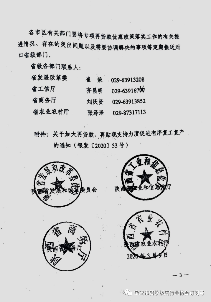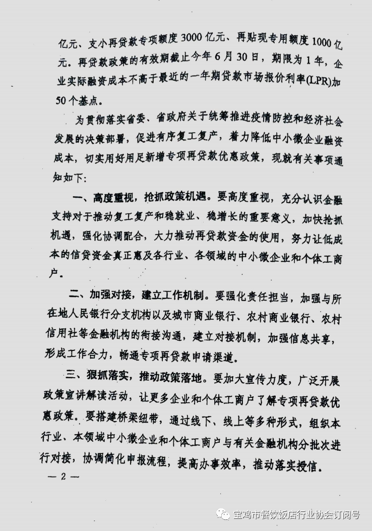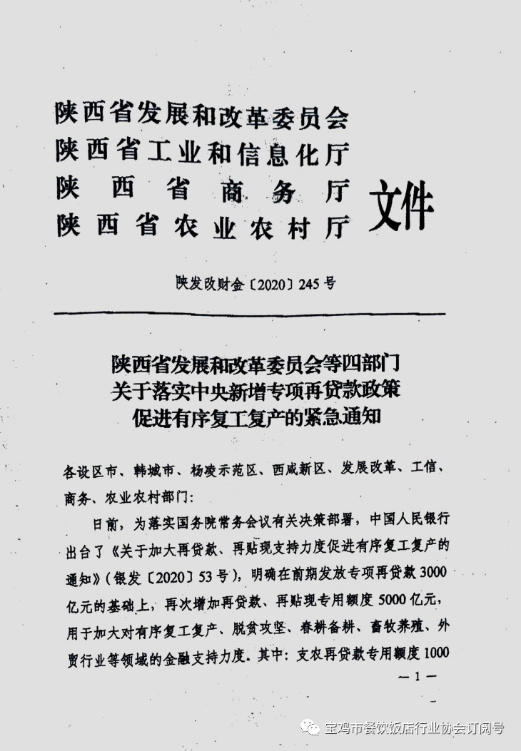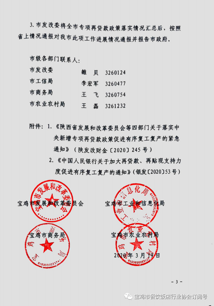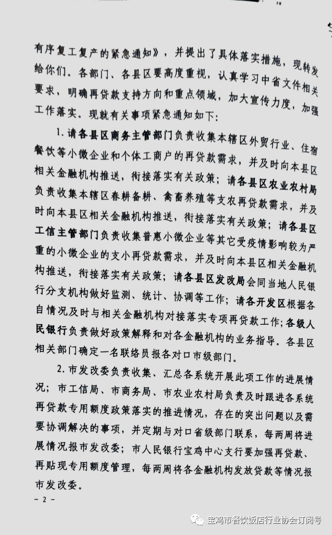 为落实中省关于统筹推进疫情防控和经济社会发展的决策部署,促进有序复工复产,着力降低中小微企业融资成本,中国人民银行出台了《关于加大再贷款、再贴现支持力度促进有序复工复产的通知》,省发改委、省工信厅、省商务厅、省农业农村厅联合下发了《关于落实中央新增专项再贷款政策促进有序复工复产的紧急通知》,并提出了具体落实措施、现转发给你们。各部门、各县区要高度重视,认真学习中省文件相关要求,明确再贷款支持方向和重点领城,加大宣传力度,加强工作落实。现就有关事项紧急通知如下:1.请各县区商务主管部门负责收集本辖区外贸行业、住宿餐饮等小微企业和个体工商户的再贷款需求,并及时向本县区相关金融机构推送,衔接落实有关政策;请各县区农业农村局负责收集本辖区春耕备耕、禽畜养殖等支农再贷款需求,并及时向本县区相关金融机构推送,衔接落实有关政策;请各县区工信主管部门负责收集普惠小微企业等其它受疫情影响较为严重的小微企业的支小再贷款需求,并及时向本县区相关金融机构推送,衔接落实有关政策;请各县区发改局会同当地人民银行分支机构做好监测、统计、协调等工作;请各开发区根据各自情况及时与相关金融机构对接落实专项再贷款工作;各级人民银行负责做好政策解释和对各金融机构的业务指导。各县区相关部门确定一名联络员报各对口市级部门。2.市发改委负责收集、汇总各系统开展此项工作的进展情况;市工信局、市商务局、市农业农村局负责及时跟进各系统再贷款专用额度政策落实的推进情况,存在的突出问题以及需要协调解决的事项,并定期与对口省级部门联系,每两周将进展情况报市发改委;市人民银行宝鸡中心支行要加强再贷款、再贴现专用额度管理,每两周将各金融机构发放贷款等情况报市发改委。3.市发改委将全市专项再贷款政策落实情况汇总后,按照省上情况通报对我市此项工作进展情况通报并报告市政府。1.《陕西省发展和改革委员会等四部门关于落实中央新增专项再贷款政策促进有序复工复产的紧急通知》(陕发改财金【2020】245号)2.《中国人民银行关于加大再贷款、再贴现支持力度促进有序复工复产的通知》(银发【2020】53号)