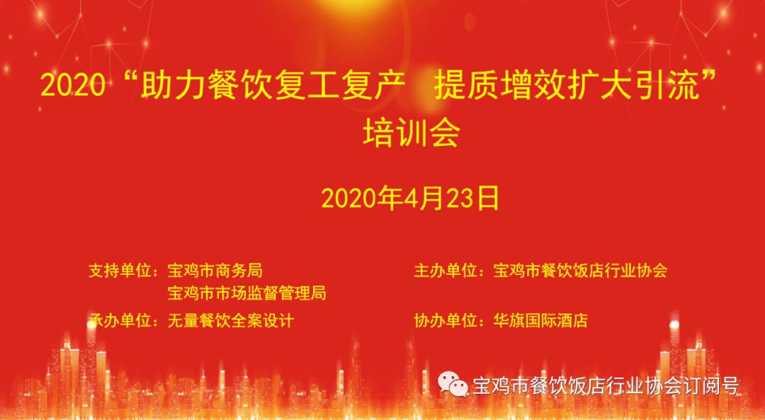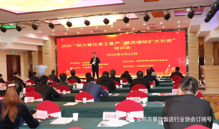 2020年第一季度是全国餐饮行业最难忘的时刻,我们餐饮人众志成城,攻克难关。在过去的日子里,疫情使我们损失严重。我们用坚强的毅力挺了过来,现在我们用智慧改革经营,用办法创造奇迹,用毅力征服美好。4月23日下午,由宝鸡市餐饮饭店行业协会主办的“2020‘助力餐饮复工复产 提质增效扩大引流’培训会”正式开幕。