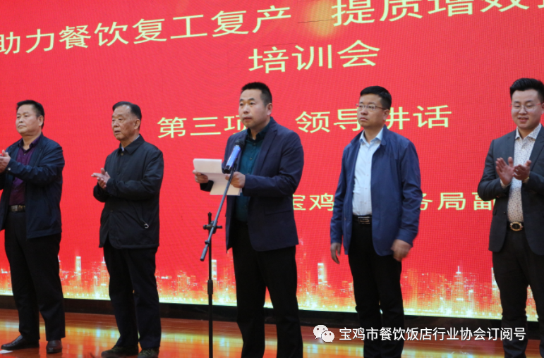 市商务局副局长黄宁安讲话:疫情之下,市餐饮饭店行业主动作为,充分发挥积极作用,充分准备、积极协调,组织全市各餐饮示范店、明星企业、品牌企业,召开餐饮企业“助力餐饮复工复产 提质增效扩大引流”专题培训会,是提振餐饮行业的信心、推动餐饮业消费潜能释放的有效举措,必将给我们餐饮业疫情防控和餐饮业经济复苏发展带来实实在在的效果,商务局将以“国际(丝路)美食之都”深化建设为契机,不断挖掘和展示宝鸡美食深厚的文化底蕴和历史渊源,持续推进宝鸡美食“走出去”,加强宝鸡餐饮品牌的宣传推介和品质提升,使美食产业成为助推宝鸡经济高质量发展的内生动力,通过这些实实在在的举措,持续暖商、促销、惠民,营造便利、放心的消费环境,支持餐饮服务业发展,促进全市商务经济平稳增长。