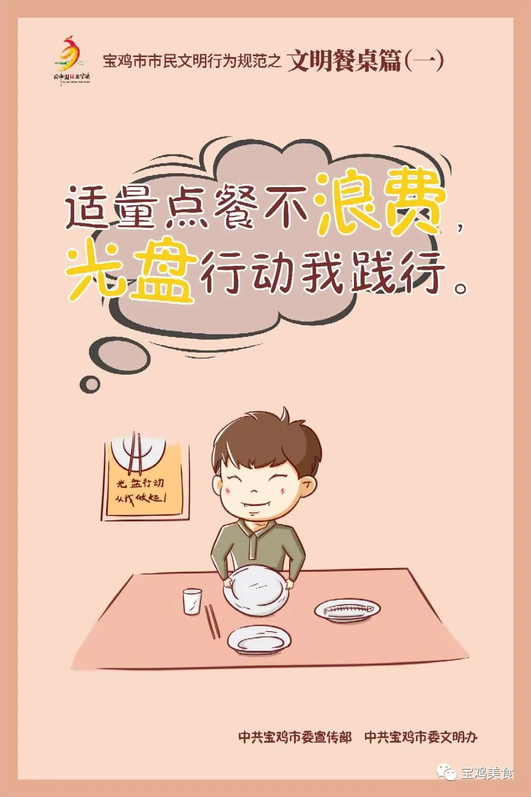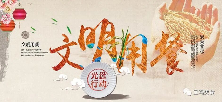 “谁知盘中餐、粒粒皆辛苦”。让我们身体力行,我“光盘”我光荣,厉行节约、文明用餐,从我做起,从现在做起,从点滴细节做起,拒绝“舌尖上的浪费”,与陋习告别、与文明握手,将环保、低碳、文明、节俭进行到底,用理性、健康的生活方式,展示文明宝鸡的美好形象。