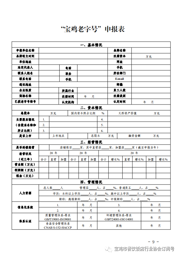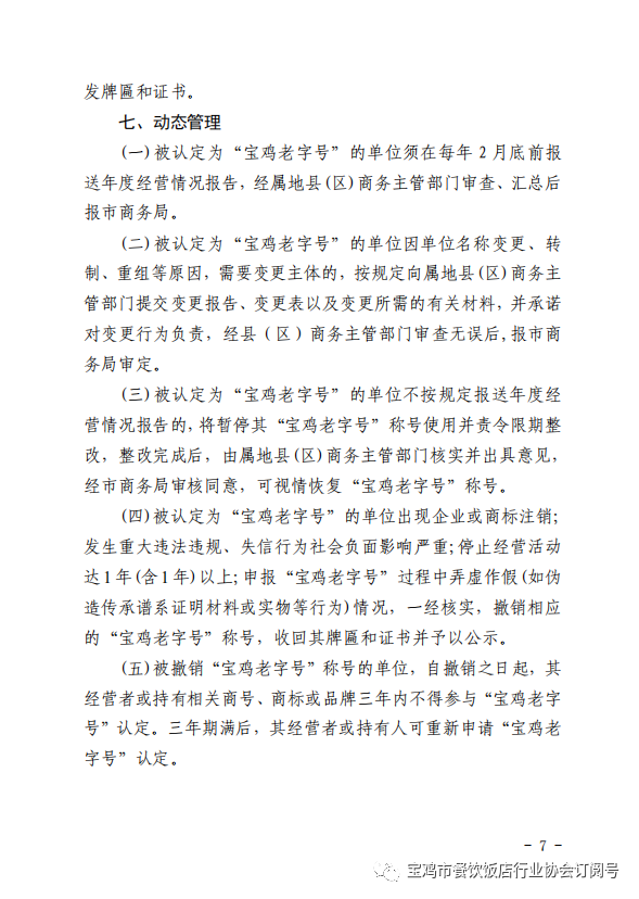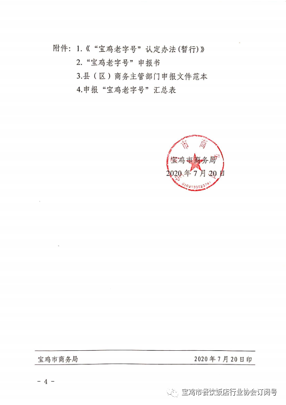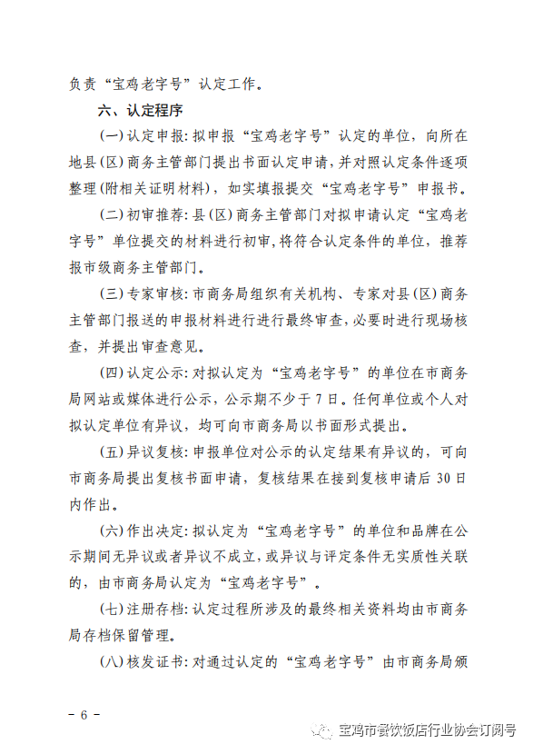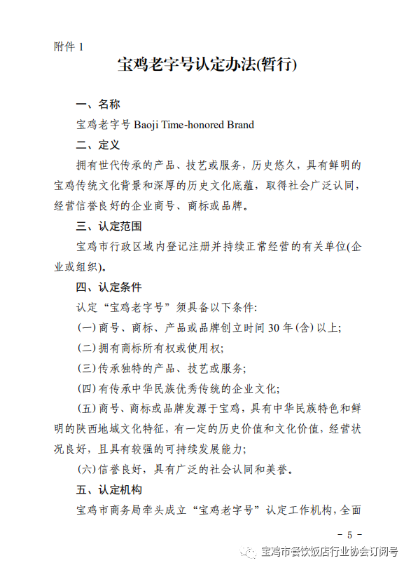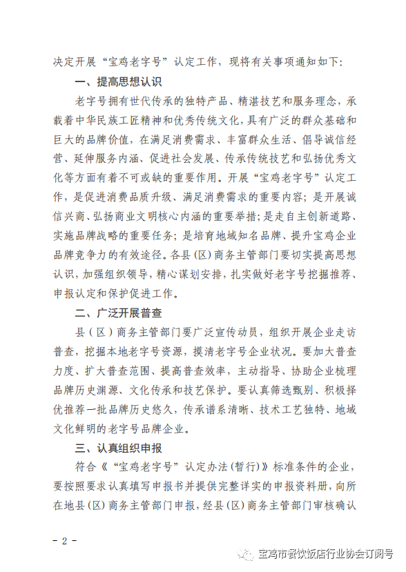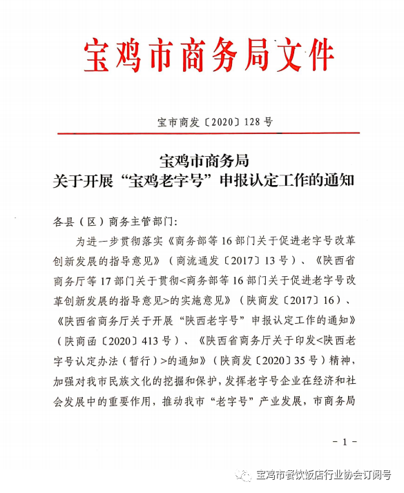 为进一步贯彻落实《商务部等16部门关于促进老字号改革创新发展的指导意见》(商流通发【2017】13号)、《陕西省商务厅等17部门关于贯彻<商务部等16部门关于促进老字号改革创新发展的指导意见>的实施意见》(陕商发【2017】16)、《陕西省商务厅关于印发<陕西老字号认定办法(暂行)>的通知》(陕商发【2020】35号)精神,加强对我市民族文化的挖掘和保护,发挥老字号企业在经济和社会发展中的重要作用,推动我市“老字号”产业发展,市商务局决定开展“宝鸡老字号”认定工作,现将有关事项通知如下: