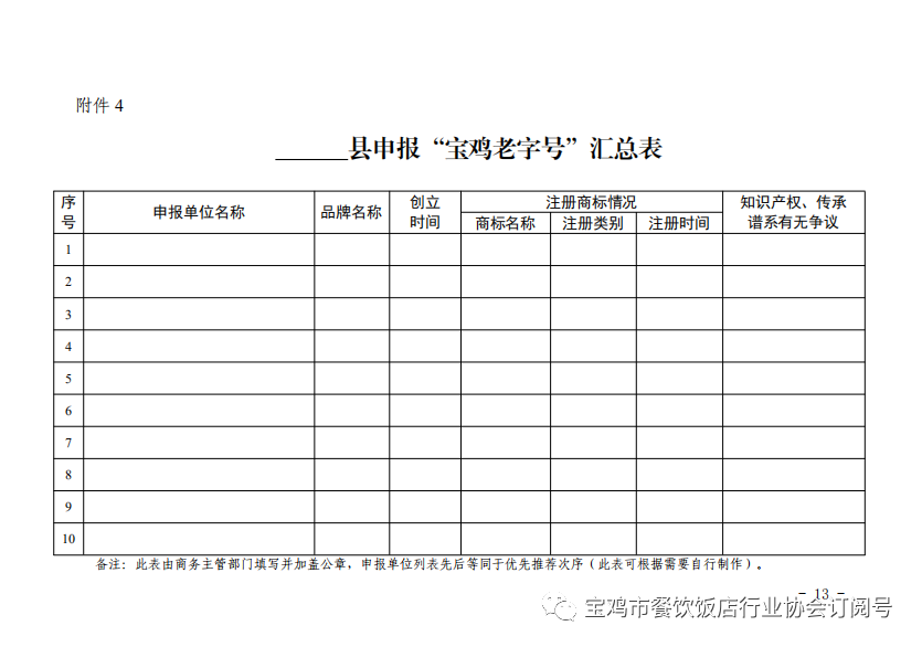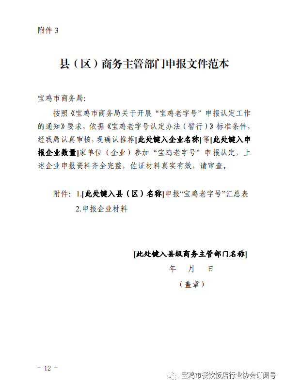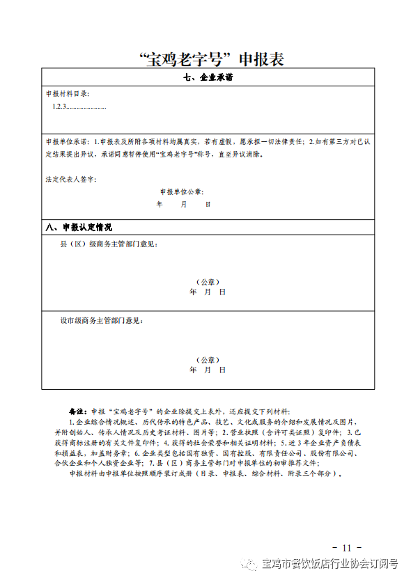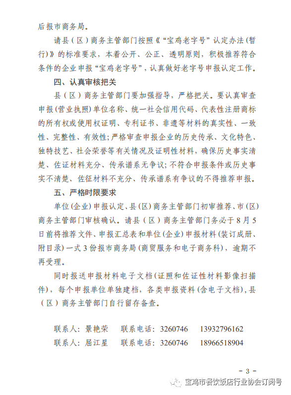 符合《“宝鸡老字号”认定办法(暂行)》标准条件的企业要按照要求认真填写申报书并提供完整详实的申报资料册,向所在地县(区)商务主管部门申报,经县(区)商务主管部门审核确认后报市商务局。请县(区)商务主管部门按照《“宝鸡老字号”认定办法(暂行)》的标准要求,本着公开、公正、透明原则,积极推荐符合条件的企业申报“宝鸡老字号”,认真做好老字号申报认定工作。